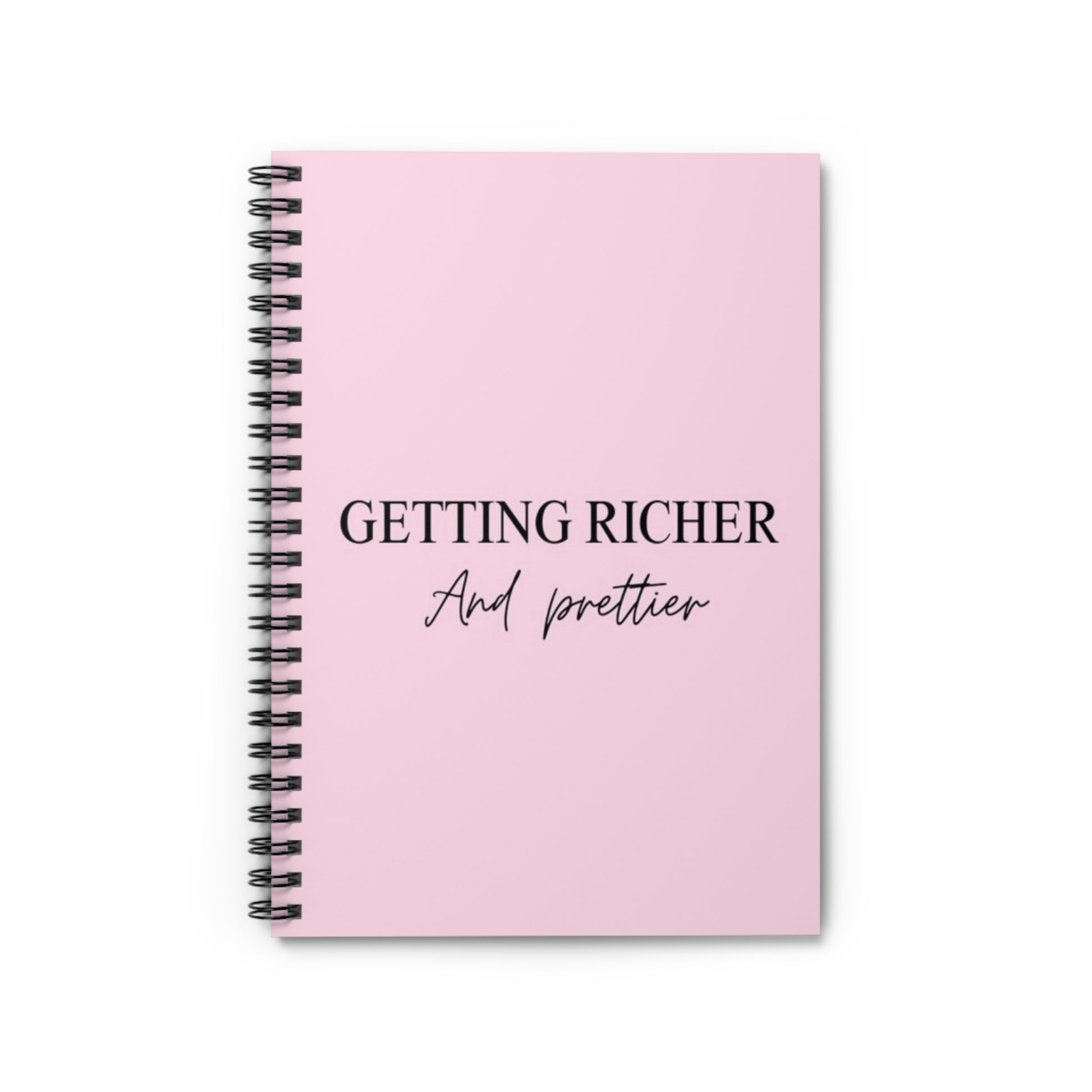 Elevate your writing experience with this stylish Spiral Notebook, designed for those who appreciate both aesthetics and functionality. Its chic pink cover, adorned with the inspiring phrase 'Getting Richer And Prettier', adds a touch of motivation to your daily notes and journaling. Perfect for students, professionals, or anyone who loves to jot down ideas, this notebook effortlessly fits into your life whether at home, in the office, or on the go. It makes a thoughtful gift for birthdays, celebrations, or just because. Celebrate new beginnings or accomplishments with a notebook that inspires creativity and ambition!
